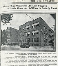This ad talks about the expansion of the Ludwig & Ludwig Factory. They talk about a house being moved and one being wrecked. It also says this will add additional square footage of 34,560. It appears from other articles that the factory was around 85,000 sqf in total after the expansion.
