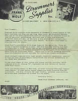 Frank Wolf opened his drum business in or around 1910. Prior to World War II, Wolf's store was across the street from Manny's Music. In the Catalog Section you will see two sales sheet/advertisements for Frank Wolf's Drummers Supply store and also a green flyer promoting Frank Wolf Drums. Mr Wolf was famous for making the 2 to 1 snare. 12 lugs on the top head and 6 lugs on the bottom head!