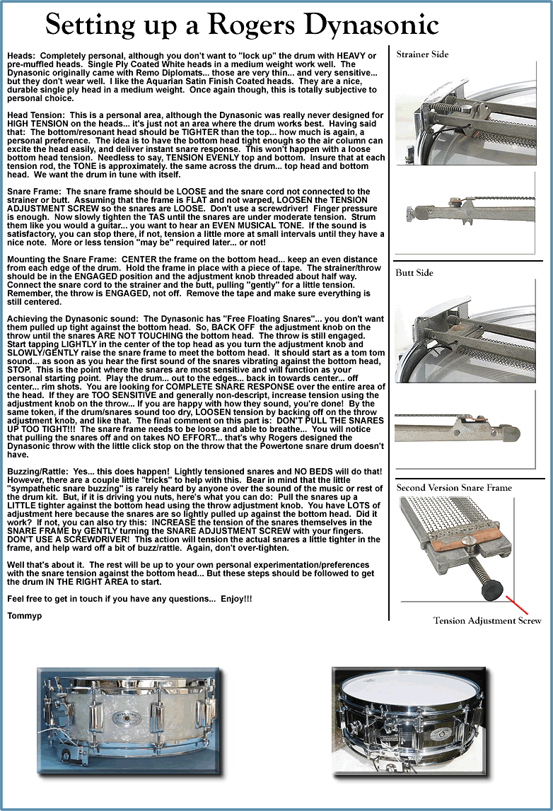 This topic has been discussed on a variety of web sites and drum forums. My good friend TommyP has been getting a steady stream of questions on how to tune and "Set Up" a Rogers Dynasonic Snare Drum. It is very common for people to say that their Dynasonic sounds terrible or they can't get it to sound the way they want it. It is also common for people to remove the snare frame since they get frustrated with the performance of the drum.